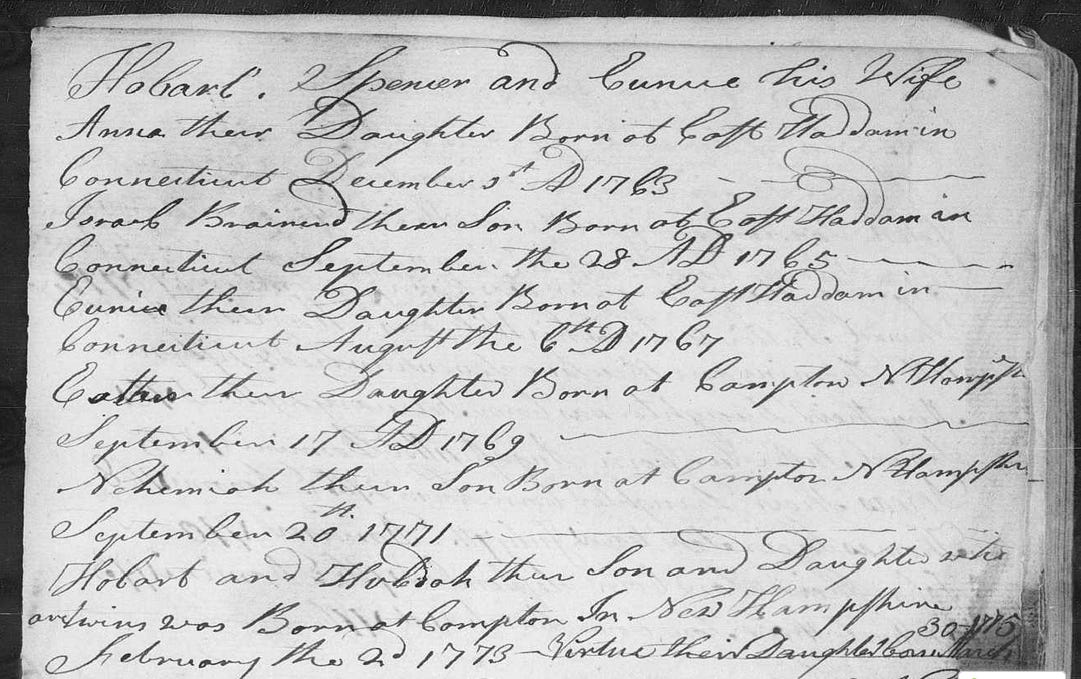 The children of Hobart Spencer and Eunice, his first wife, were recorded in the Town Records of Campton, Grafton, New Hampshire. It was probably written in 1836, as that is the date of the entry on the previous page. Eunice gave birth in East Haddam, Connecticut, to Anna on 3 December 1763, Israel Brainard on 28 September 1765, and Eunice on 6 August 1767. Then, around 1769, the family moved to Campton, where Esther was born on 17 September 1769, Nehemiah was born on 20 September 1771, twins Hobart and Huldah were born on 2 February 1773, and Virtue was born on 30 March 1775.2